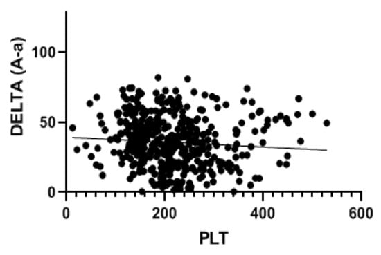 Platelet level in patients with SARS-CoV-2 infection correlated with DELTA (A-a) duringblood gas analysis at entry to the emergency department. The value indicated for platelets (PLT) is ×109/L. In COVID-19 patients, the platelet count correlated with the A-aO2 (p = 0.001, rho = −0.149).