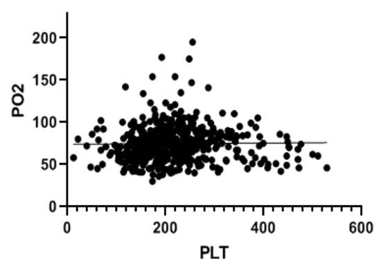 Platelet level in patients with SARS-CoV-2 infection correlated with pO2 during blood gas analysis at entry to the emergency department. The value indicated for platelets (PLT) is ×109/L. In COVID-19 patients, the platelet count correlated with the values of PaO2 (p = 0.036; rho = 0.093).