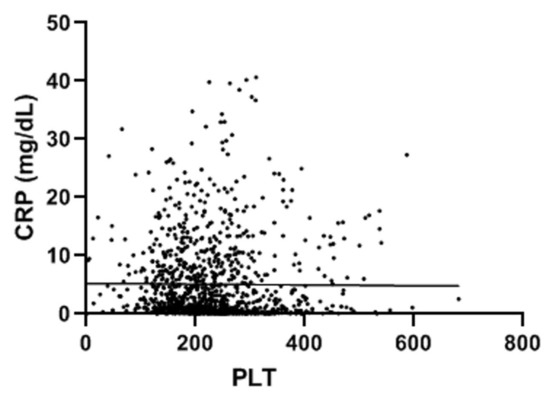 Platelet count inversely correlated with C-reactive protein (p < 0.001). The value indicated for platelets (PLT) is ×109/L. CRP: C-reactive protein.