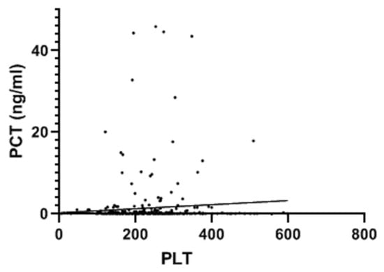 Platelet count did not correlate with procalcitonin (p = 0.96). The value indicated for platelets (PLT) × 109/L. PCT: procalcitonin.