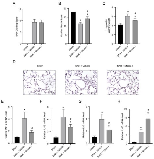 The wet weight/dry weight (W/D) ratio, a parameter of the lung water contents, increased significantly in the SAH + vehicle group in comparison to the sham-operated group (p < 0.05, Figure 1C). Compared with the SAH + vehicle group, the DNase-1 treatment group showed a significant reduction in the W/D ratio (p < 0.05, Figure 1C).