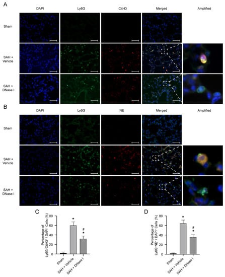 We used several markers to represent NET formation, such as CitH3 and NE. There were almost no CitH3-Ly6G-positive cells and NE-Ly6G-positive cells detected in the lung tissue of the sham-operated group (Figure 2A,B). In comparison to the sham-operated group, the NETs in the lung tissue in the SAH + vehicle group increased significantly, whereas the DNase-1 treatment after SAH significantly inhibited the level of NETs in the lung tissue (p < 0.05, Figure 2A–D and Supplementary Figure S2).