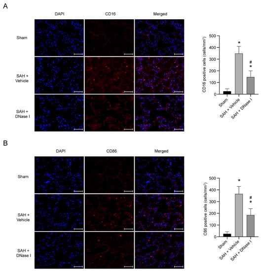 We use two markers (CD16 and CD86) to represent the proinflammatory subtype transition of the macrophage. The sham-operated group showed a few CD16-positive cells and CD86-positive cells in the lung tissue (Figure 3A,B). Compared with the sham-operated group, the CD16-positive cells and CD86-positive cells in the SAH + vehicle group increased significantly, while the DNase-1 treatment after SAH significantly reduced the level of CD16-positive cells and CD86-positive cells in the lung tissue (p < 0.05, Figure 3A,B).