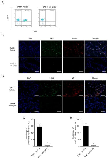 Ly6G depletion decreases the formation of NETs in NPE after SAH. (A) Representative flow cytometry analysis of the blood from SAH mice in different groups. (B) Representative photograph of the colocalization of CitH3 (red) with Ly6G (green) in different groups. The nuclei were stained with DAPI (blue). Scale bar = 50 μm. (C) Representative photograph of the colocalization of NE (red) with Ly6G (green) in different groups. The nuclei were stained with DAPI (blue). Scale bar = 50 μm. (D) Quantitative analysis of CitH3-positive neutrophils; n = 5/group. (E) Quantitative analysis of NE-positive neutrophils; n = 5/group. * p < 0.05 versus the SAH + vehicle group.