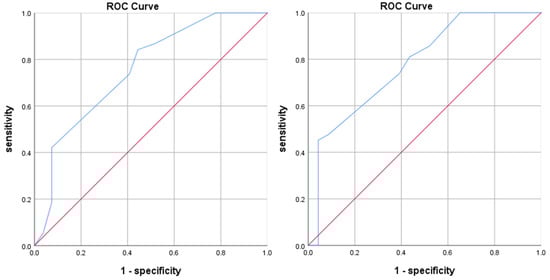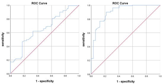 ROC curves for the internal validation (left) and validation cohorts (right).