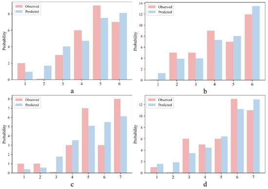 Results of the Hosmer–Lemeshow test for IG (a) and PG (b) in the internal validation cohort, and IG (c) and PG (d) in the validation cohort.