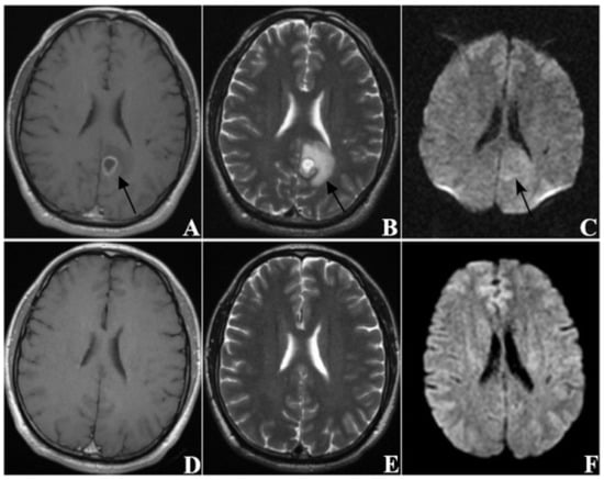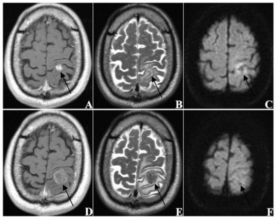 All the MRI images were analyzed in consensus by two experienced neuro-radiologists (with 10 and 15 years of experience in central nervous system radiological diagnosis). Radiological manifestations, including location (frontal lobe, occipital lobe, temporal lobe, parietal lobe, cerebellum, brain stem, and other), number, volume, maximum diameter, EI, DWI sequence signal (hypo-intensity, iso-intensity, and hyper-intensity), and enhanced pattern (homogeneous, heterogeneous, and ring-like patterns), were assessed. The EI was calculated according to the method proposed by Kim et al. [].