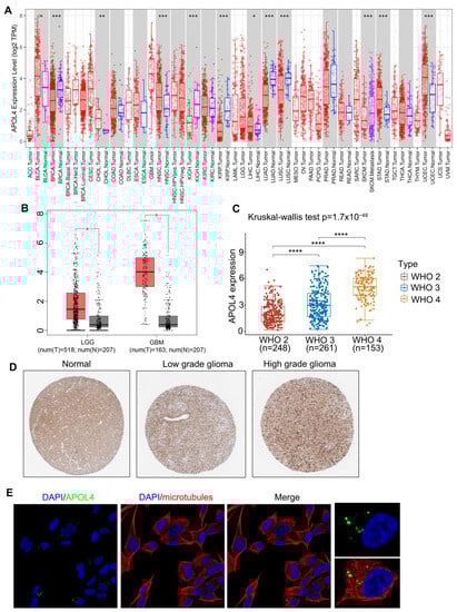 We obtained the mRNA expression profile datasets containing the clinical information from the public databases CGGA (http://www.cgga.org.cn/) (accessed on 21 February 2022) and TCGA (https://cancergenome.nih.gov/) (accessed on 25 February 2022). The TCGA database divides gliomas into LGG (low grade glioma) and GBM. In TCGA, the three cohorts (glioma, LGG, and GBM) were named TCGA_ LGG_GBM, TCGA_LGG, and TCGA_GBM, respectively. We applied R software to preprocess the gene expression profiles, including background correction, normalization, and log2 transformation. To evaluate the expression of APOL4 in the tissues of gliomas and other tumors, we employed the TIMRE database (https://cistrome.shinyapps.io/timer/) (accessed on 13 May 2022) to compare the expression of APOL4 in tumor and corresponding normal tissues. Additionally, the GEPIA (http://gepia.cancer-pku.cn/index.html) (accessed on 21 June 2022) was also used to explore the APOL4 expression in LGG, GBM, and normal tissues. The expression of APOL4 in different World Health Organization (WHO) grades (WHO 2021) was also examined, the same as we did []. The APOL4 protein levels in glioma and normal tissues was assessed by the HPA website (https://www.proteinatlas.org) (accessed on 28 June 2022). Moreover, the location of the APOL4 protein was also explored by the HPA.