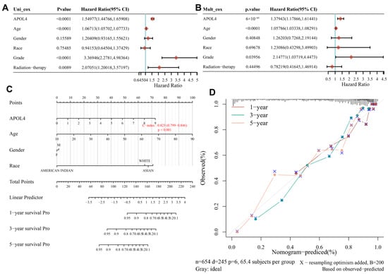 The prognostic value of APOL4. (A,B) Univariate and multivariate Cox regression. (C) Nomogram and calibration plots (D) predicting the OS of glioma patients.