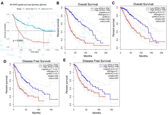 APOL4 is a member of the lipoprotein L family, which encodes a protein that may play a role in the reverse transport of cholesterol from peripheral cells to the liver and in the transport and exchange of lipids throughout the body. The APOL gene family is thought to be innate immune genes that evolved rapidly in the primate lineage, and their expression is upregulated by proinflammatory signals [,]. It has been reported that APOL4 may be a prognostic marker for breast cancer []. However, whether these is a relationship between APOL4 and glioma has not been studied.