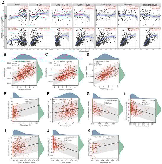 The connection between APOL4 and TIIC infiltration. (A) The relationship of APOL4 with TIIC infiltration in the TIMER database. The correlation between APOL4 and the immune (B), stromal (C), and ESTIMATE scores (D). The correlation of APOL4 with the infiltration of macrophages M1 (E), M2 (F), naïve CD4+ T cells (G), T cells follicular helper (H), T cells CD memory resting (I), and B cell memory (J) in LGG. (K) The relationship of APOL4 with the infiltration of macrophage M1 in GBM.