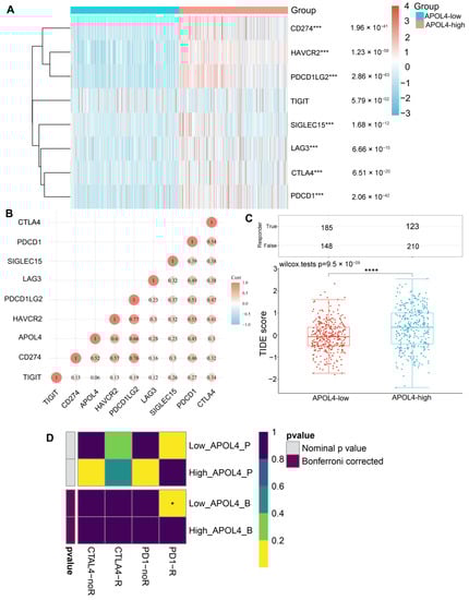 The expression of several immune checkpoints was assessed in the APOL4-high and APOL4-low (The median was used to distinguish between high and low groups.) groups, as we previously studied []. The correlation of APOL4 with immune checkpoints was analyzed by Spearman’s correlation analysis. The TIDE scores and subclass mapping showing the sensitivity to ICI therapy were calculated in the APOL4-high and APOL4-low groups [].