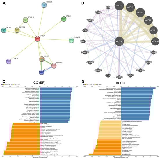 The potential role of APOL4 in gliomas. (A,B) The PPI network of APOL4 from the STRING and GeneMANIA databases, respectively. GO (C) and KEGG (D) analyses of APOL4 in gliomas.