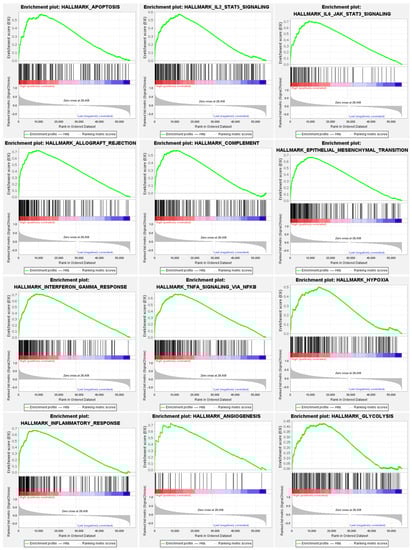 To further discover the potential function of APOL4 in gliomas, we established the PPI network of APOL4 in the STRING and GeneMANIA webtools. The results from STRING indicated that APOL4 may interplay with APOO, CHRM4, C15orf26, COMT, PRODH, POX2, LALRAD1, OR10H1, NPIPB9, and OR10H5 (Figure 6A). The results in GeneMANIA indicated that APOL4 may interplay with APOL3, APOL2, APOL5, APOL6, APOL1, APOLD1, TRPM8, BTN2A2, SLC45A3, PSEN2, and NLRC5 (Figure 6B). The biological process the GO analysis demonstrated was that APOL4 was involved in numerous immune-related processes, including IFN-γ production, response to type I interferon, adaptive immune response, activation of T cells, neutrophil mediated immunity, granulocyte activation, humoral immune response, leukocyte proliferation, response to virus, lymphocyte mediated immunity, cytokine metabolic process, type I interferon production, leukocyte cell–cell adhesion, cellular defense response, regulation of innate immune response, positive regulation of immune effector process, leukocyte migration, positive regulation the production of cytokine, and regulation of leukocyte activation (Figure 6A). APOL4 was also related to the regulation of trans-synaptic signaling, synaptic vesicle cycle, and the glutamate receptor-signaling pathway in gliomas (Figure 6A). The KEGG pathway analysis illustrated that APOL4 was associated with the staphylococcus aureus infection, intestinal immune network of IgA production, leishmaniasis, autoimmune thyroid disease, allograft rejection, asthma, phagosome, systemic lupus erythematosus, toxoplasmosis, hematopoietic cell lineage, herpes simplex infection, type I diabetes mellitus, inflammatory bowel disease, pertussis, tuberculosis, antigen processing and presentation, DNA replication, and cytokine–cytokine receptor interaction in gliomas (Figure 6D). Additionally, APOL4 was related to nicotine addiction, taste transduction, and glutamatergic synapse in gliomas (Figure 6D). The GSEA analysis indicated that several immune-related pathways were positively correlated to high APOL4 expression, including apoptosis, IL2-STAT5 signaling, IL6-JAK-STAT3 signaling, allograft rejection, complement, epithelial–mesenchymal transition, interferon gamma response, TNFα signaling via NF-κB, hypoxia, inflammatory response, angiogenesis, and glycolysis (p < 0.05) (Figure 7). These findings indicated that APOL4 may participate in the immune-related pathways in gliomas.
