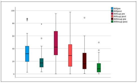 Boxplot showing postoperative improvement of AHI, AHI supine, and AHI non supine. AHI (Apnea Hypopnea Index), AHI sup (Apnea Hypopnea Index supine), AHI nsup (Apnea Hypopnea Index non-supine). Pre (Pre-operative), Post (Post-operative). Asterisk and circles represent outliers.
