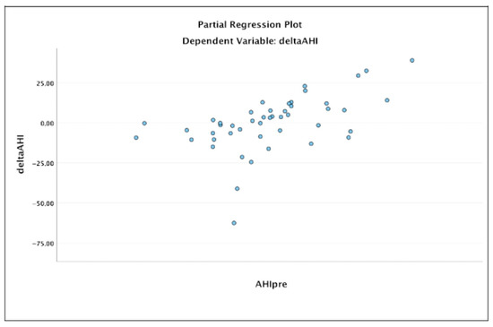 Linear regression graphs showing the relationship between preoperative AHI and delta-AHI.
