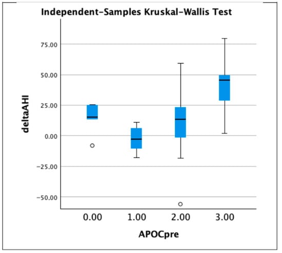 Boxplots showing delta AHI in patients divided in groups according to APOC classification (group 0 stands for non-classifiable APOC; 1.00 = APOC 1, 2.00 = APOG 2, and 3.00 = APOC 3). Circle represent outliers.