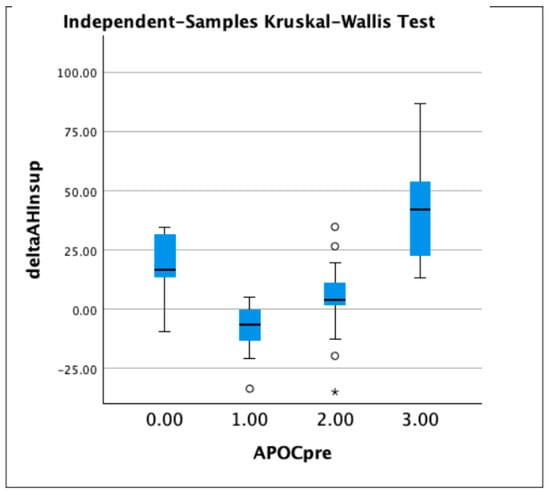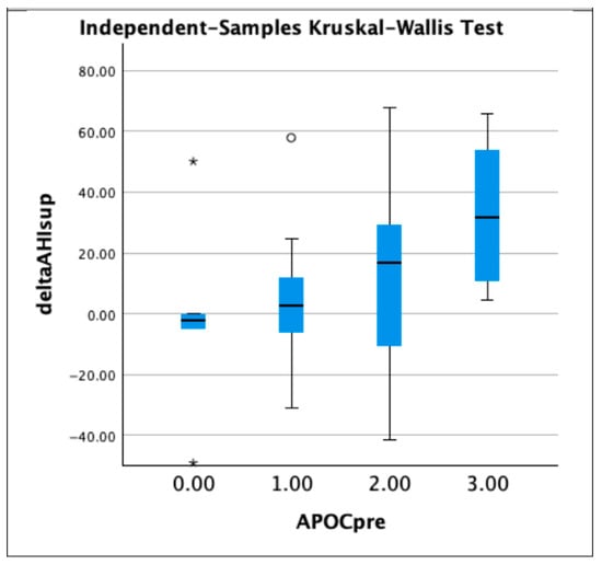 Boxplots showing delta AHI supine in patients divided in groups according to APOC classification (group 0 stands for non-classifiable APOC; 1.00 = APOC 1, 2.00 = APOG 2, and 3.00 = APOC 3). Asterisks and circle represent outliers.