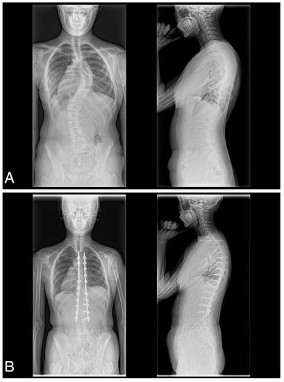 Adolescent idiopathic scoliosis (AIS) is one of the most common spinal deformities and is characterized by lateral spinal curvature with axial rotation and, typically, hypokyphosis of the thoracic spine []. AIS patients show different postural control and patterns [,,,]. The change in posture is a possible reason for abnormal load upon the spine and secondary deformity. Patients with AIS with a Cobb angle greater than 40 degrees may require surgical treatment and spinal deformity correction, leading to changes in postural balance.