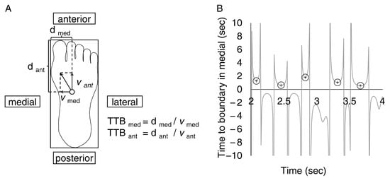 Time-to-boundary (TTB) is a recently developed multidimensional measure to evaluate postural stability that incorporates body sway with the base of support [,,]. This outcome records the position and speed of the center of pressure (COP) in relation to the base of support, indicating how much time remains before the COP comes into contact with the base of support boundary. Therefore, TTB can highlight the crucial components of postural control and record the most difficult period during the stance period. Hertel et al. [] suggested that TTB measures capture a component of postural stability that is distinct from conventional COP-based measures because there was a weak correlation between TTB results and conventional COP-based results. Additionally, it has been shown that TTB is more effective at identifying individuals with chronic ankle instability than conventional COP-based assessments []. Compared to conventional COP-based measures, TTB offers a deeper understanding of the spatiotemporal features of postural control since it takes into consideration the direction and location of the COP relative to the foot border [].