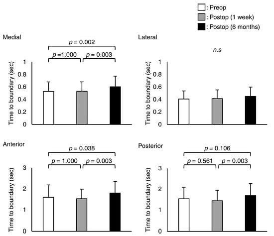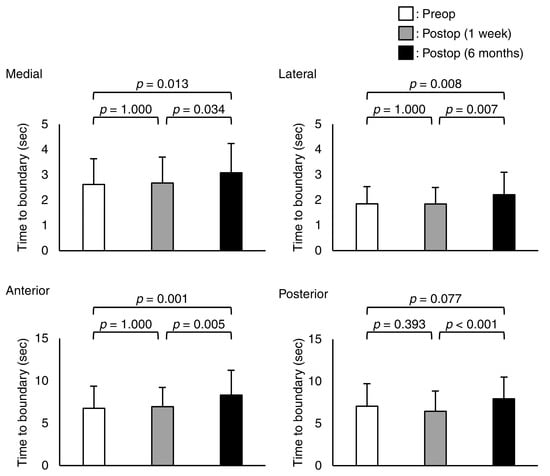 In the medial, anterior, and posterior directions, the absolute minimum TTB measurements were significantly different (p < 0.001, p = 0.049, and p = 0.003, respectively) (Figure 3). In the post hoc test, the absolute minimum values of TTB for the medial and anterior at 6 months postoperatively were higher than those in the preoperative and 1 week postoperative trials (p = 0.002, p = 0.003, p = 0.038, and p = 0.003, respectively). The absolute minimum values of posterior TTB at 6 months postoperatively were higher than that at 1 week postoperatively (p = 0.003).