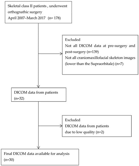 This retrospective study examined patients at Tokyo Dental College Chiba Dental Center from April 2007 to March 2017. The inclusion criteria were as follows: (1) had been diagnosed with skeletal class II dentofacial deformities; (2) had undergone orthognathic surgery; and (3) had undergone CT (computed tomography) of the skull at the time of pre- and post- orthodontic treatment (1–2 years after orthognathic surgery). The exclusion criteria were (1) patients presenting with congenital disorders that give rise to orofacial and dental structural abnormalities and (2) individuals with a medical history involving tumors or trauma affecting the head and neck region. One hundred and seventy-eight CT images of pre- and post-treatment were collected in the first step. Of these, 146 images were excluded; specifically, 139 images lacked DICOM (Digital Imaging and Communication in Medicine) data pre- and post-treatment, and 7 lacked the required craniomaxillofacial images. Two of the remaining sources of DICOM data from patients were excluded due to inadequate quality. A final 30 patients achieved the criteria and were included in the current study (Figure 2). There were 4 men and 26 women among the patients. At the time of surgery, the average patient was 27.2 years old. A total of 14 patients had BSSRO (bilateral sagittal split ramus osteotomy) alone, and 16 had BSSRO combined with Le Fort I osteotomy, constituting a two-jaw surgery. Four specialized orthodontists diagnosed, planned, and conducted surgical orthodontic treatment using the same methodology. Two specialist oral surgeons performed all surgical procedures at the Department of Oral and Maxillofacial Surgery, Tokyo Dental College.