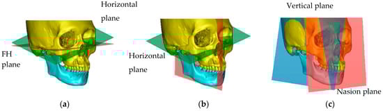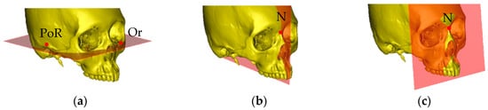 According to the procedure described by Kim et al. [], the following three reference planes in the maxilla were established: (a) the Frankfort horizontal (FH) plane; (b) the midsagittal reference (MSR) plane, which is the horizontal plane passing through the nasion (N), sella (S), and basion (Ba); and (c) the nasion (N) plane, which is a vertical plane passing through the nasion and perpendicular to the FH plane (Figure 3).