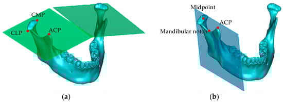 The 3D condyle measurement planes: (a) condylar horizontal plane: the plane passing through the condylar medial pole (CMP), the condylar lateral pole (CLP), and the apex of the coronoid process (ACP); (b) condylar vertical plane: the plane passing through the midpoint between the condylar medial and condylar lateral poles, the ACP, and the deepest point of the mandibular notch.