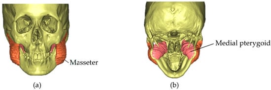 Reconstruction of the (a) masseter and (b) medial pterygoid muscles was performed; regarding the results of the reconstructed models, the SimPlant OMS Pro 14.0 software calculated the muscle volumes automatically.