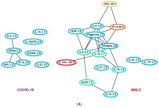 (A) Ratio of median cytokine levels in COVID-19 patients to healthy controls and in MIS-C patients to controls for all cytokines/chemokines that are elevated/depressed two-fold or more. The network uses protein–protein interactions (black) from the STRING database to determine connections. Nodes are colored based on the fold change, and the actual fold change is also included in the node label. Many more cytokines/chemokines are inflamed in MIS-C compared to COVID-19. (B) Ratio of median cytokine levels in COVID-19 and MIS-C patients to controls for all cytokines elevated or depressed at least two-fold. The network includes non-measured proteins that have protein–protein interactions with at least four measured cytokines. We can see that network dysfunction is more pronounced in MIS-C compared to COVID-19. In the COVID-19 network, we see IL-15, scD40L and IL-12 p(70) connecting to the MIG, IP-10 and IL-6 subnetwork via IL-4. In addition, IL-22 connects back to core subnetwork in COVID-19 via IL-6. In the MIS-C network, IL-22 connects to the core connected component via IL-10. (C) (left) Differentially expressed cytokines in MIS-C versus COVID-19 elevated or depressed at least two-fold. Nodes are labeled with the ratio of median cytokine levels in MIS-C to the median cytokine levels in COVID-19. (right) Differentially expressed cytokines in context of other non-measured proteins that have interactions with at least four measured cytokines. The red edge in the left network denotes correlation of 0.8 or more in the training data between the pair of cytokines/chemokines.