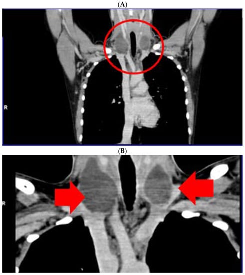 HS as first presentation of a large thyroid lump/goiter/cancer is due to CSC compression; the level of statistical evidence remains a few case reports [48,49,50]. Both benign and malign nodular thyroid conditions may present HS (one case of Riedel’s thyroiditis is reported) [51,52,53,54]. Remarkably, one adult female had unusual brain metastasis (in addition to cervical and lung spreading) from a papillary thyroid carcinoma with HS as onset element since HS—related ONP lesions might be presented not only at neck level [55].