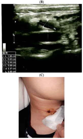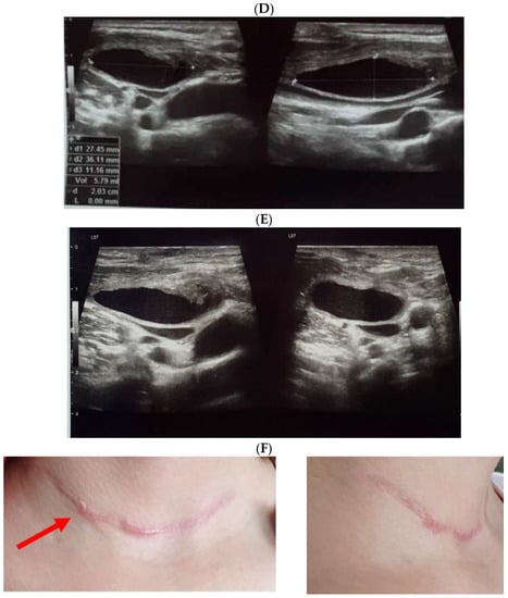 The evolution of within following weeks after thyroid surgery ultrasound features. (A). Right neck ultrasound aspect at the moment of fine needle aspiration (5 weeks since surgery)—on the right and 6 days after fine needle aspiration procedure (after cvasi-complete evacuation, the cystic mass relapsed within 48 h)—on the left. (B). Right neck ultrasound within the first day of tube drainage (6 weeks since initial surgery) showing a massive reduction of the cystic mass. (C). Drainage tube was removed after 4 days. Post-thyroidectomy scar and post-tube removal aspect. (D). Right neck ultrasound after 2 weeks from removing the drainage—persistent cystic mass, but with progressive improvement of HS (approximately 9 weeks since initial surgery). (E). Right neck ultrasound after another 2 weeks from removing the drainage –progressive reduction of cystic mass, but with remarkable improvement of HS (approximately 11 weeks since initial surgery). (F). Scar aspect 12 weeks since surgery and 5 weeks since lymphocele drainage. (G). Recovery of HS—approximately 8 weeks since drainage. (H1,H2). Bilateral neck ultrasound 20 weeks since thyroid surgery showing regression of the lesions on both sides versus prior examinations. (H1). Right later-cervical cystic collection of 2 by 2.8 by 0.9 cm (2.5 mL) and peripheral areas of fibrotic reorganization. (H2). Left later-cervical hypoechoic, inhomogeneous mass (no vascular signal) showing fibrotic reorganization (0.25 mL).