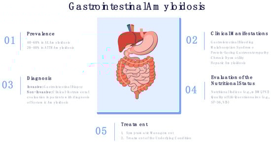 GI involvement significantly affects the nutritional status of patients with systemic amyloidosis, in some cases leading to severe malnutrition. Consequently, malnutrition leads to a deterioration in the quality of life and overall survival. Thus, clinical manifestations associated with GI should be actively evaluated in all patients with systemic amyloidosis (Figure 1).