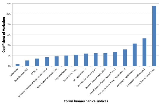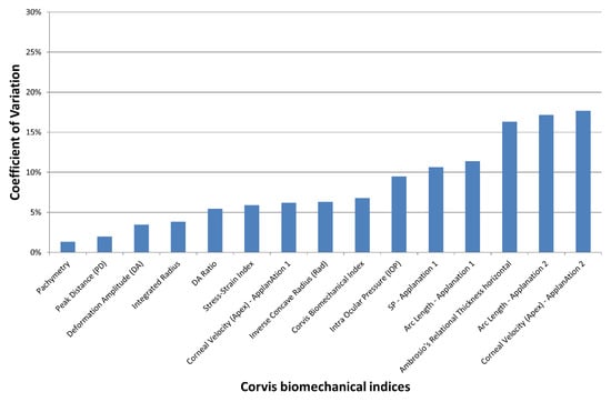 In the control group, Friedman’s analysis of variance showed no significant differences between the three observers for all indices (p > 0.1). The lowest coefficient of variation (COV) of the Corvis indices (i.e., best reproducibility) was obtained with Pachymetry and the highest (weakest reproducibility) with the Corvis Biomechanical Index (CBI; Figure 1). The mean Corvis Biomechanical Index was 28.9%. All indices except the CBI and arc length—Applanation 1 and 2—featured a COV of less than 10%. The COV of the SSI (Stress Strain Index) and PD (Peak Distance) were, respectively, 5.5% and 2.7%.