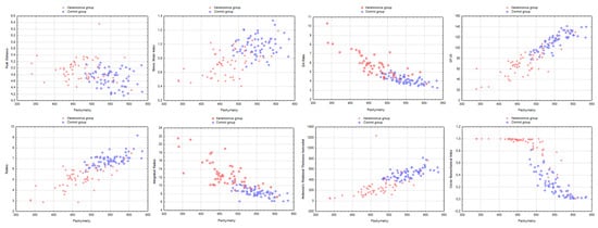 Scatterplots of the most relevant Corvis ST indices as a function of Pachymetry in both groups.