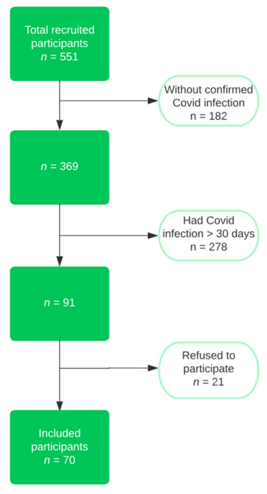 The inclusion criteria were an age of over 18 and the presence of COVID infection in the last 30 days. We excluded from the research the patients who did not have a confirmed infection in their medical history, or who went through the disease more than 30 days before recruitment. We also eliminated those who had a previous admission more than three months ago, due to the fact that any acute episode could destabilize the patient’s general condition and influence the results of the analyses; those with liver failure, chronic kidney disease with a creatinine clearance less than 15 mL/min/1.73 m2, or cardiac pacemakers; or those who did not want to participate. The flow chart of the study group selection can be observed in Figure 1.