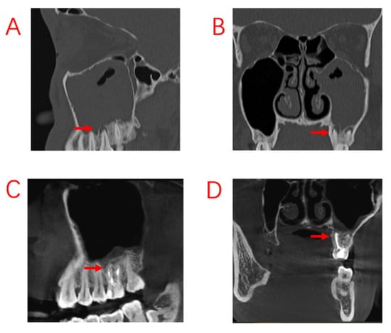 CT and CBCT have their advantages and disadvantages in the diagnosis of ODS. CT is the gold standard in the diagnosis of sinus disease due to its high resolution and ability to discern bone and soft tissue. On CT images, a full view of the sinus system can be visualized, including whether the sinonasal complex is obstructed, the extent of infection involving the sinuses, and other associated sinus diseases. However, inadequate image capture through the upper dentition and failure to thoroughly evaluate the dentition upon review of the images can lead to failure to diagnose ODS. In addition, artifacts can occur on the CT image due to fillings or metal crowns, which can interfere with the visualization of some subtle lesions []. Compared to CT, CBCT produces fewer streak artifacts and provides very high spatial resolution, compensating for the shortcomings of CT. Currently, CBCT serves as the standard diagnostic method for dental pathologies. Dental CBCT affords high spatial resolution and accurate detection of periapical lesions, oroantral fistulae, and periodontal diseases, especially in upper maxillary teeth [,]. CBCT can provide accurate parameters for digitized solutions for clinical, surgical, and restorative procedures to improve team communication and take advantage of combinations of collected data to avoid losing information using traditional manual steps [,]. The close relationship between the roots of the posterior maxillary teeth and the floor of the maxillary sinus is a major cause of the high prevalence of oral diseases and surgery-related mucosal disorders. The use of high-resolution CBCT in the dental profession has generated extensive research on the association of maxillary sinus inflammation with molar lesions [,,,]. In general, CT provides a comprehensive view of the changes in the soft and hard tissues of the sinuses, especially the bony changes in the wall of the floor of the maxillary sinus. CBCT focuses more on the changes in the dental tissues and details of the periodontal tissues.