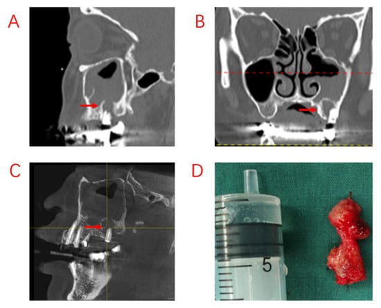 Recurrence of postoperative sinus symptoms after ESS for odontogenic sinusitis due to failure to treat the apical lesion. (A,B): Large shading of the apical area of the diseased tooth and bone penetration of the maxillary sinus floor. The maxillary sinus opening was fully opened after ESS, and the maxillary sinus mucosa could not heal completely due to the apical lesion not having been removed. (C): The apical lesion persisted despite RCT of the diseased tooth. (D): A large amount of diseased granulation tissue adhered to the apical lesion. Red arrows indicate sites of apical inflammation.
