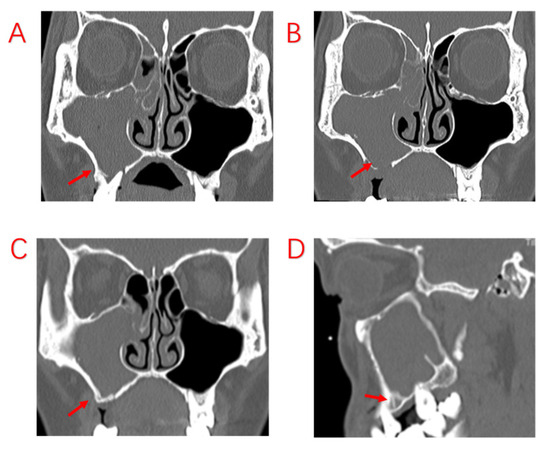 Patient undergoes tooth extraction but no sinus ESS. (A): The patient was found to have sinusitis of the right maxillary sinus at the time of tooth extraction, and the affected tooth was extracted without an oral maxillary sinus fistula. (B): The sinus CT was repeated 1 month after tooth extraction, which revealed ongoing sinus inflammation. (C,D): One year after tooth extraction, there was already new bone formation on the floor of the maxillary sinus; however, the sinus symptoms were still not relieved as the maxillary sinus was not opened. Red arrows indicate bony defects in MSF and restitution.
