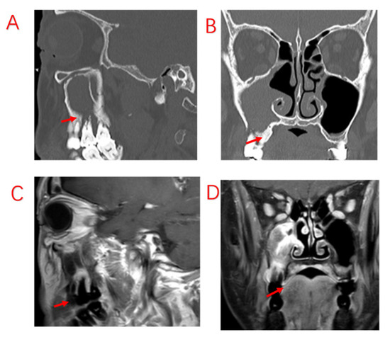 Patient with severe periodontal infection and no improvement in sinusitis symptoms after ESS. (A,B): Sinus CT shows adequate maxillary sinus opening, alveolar bone resorption of the diseased tooth, and bone defects in the MSF. (C,D): MRI shows periodontal lesion tissue attached to the mucosa of the maxillary sinus, with significant swelling of the maxillary sinus mucosa. Red arrows indicate specific sites of bony defects in MSF.