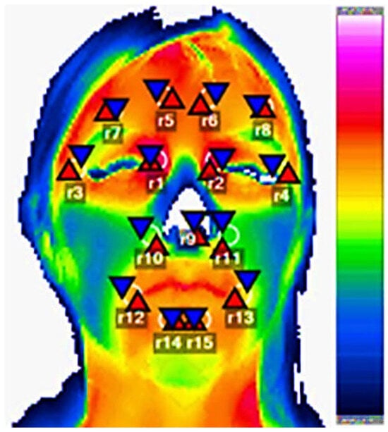 Facial point-of-care thermographic image illustrating the 15 regions of interest (ROI) used in this study. The facial cutaneous thermal distribution corresponds to a color scale displayed on the right side of the image. For this participant, thermographic values ranging from 28 °C (minimum temperature, dark blue) to 37 °C (maximum temperature, white) were identified. Regions of interest analyzed from the thermographic image, where R1 denotes the medial right palpebral corner, R2 medial left palpebral corner, R3 lateral right palpebral corner, R4 lateral left palpebral corner, R5 right frontal, R6 left frontal, R7 right temporal, R8 left temporal, R9 nasal tip, R10 right nasolabial, R11 left nasolabial, R12 right lateral commissure, R13 left lateral commissure, R14 right infralabial, and R15 left infralabial. Within each ROI, there are triangular red markings indicating the maximum temperature and blue markings indicating the minimum temperature.