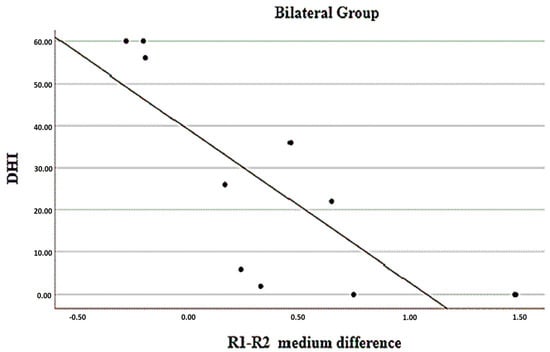 Relationship between mean difference of R1 vs. R2 with DHI in bilateral pain group. (Region of interests R1—right medial palpebral corner; R2—left medial palpebral corner).