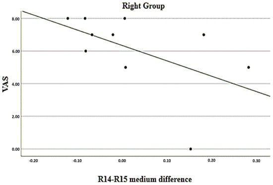 Relationship between mean difference of R14 vs. R15 with VAS in right pain group. (Region of interests R14—right infralabial; R15—left infralabial).