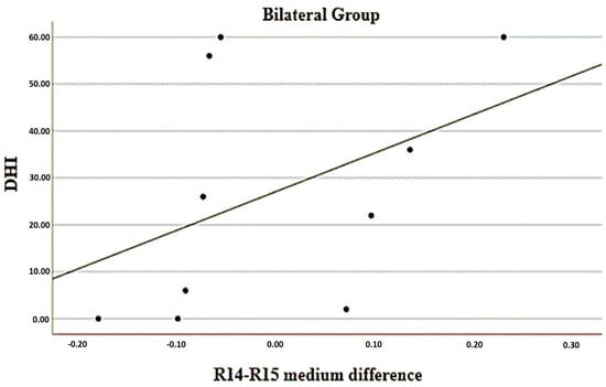 The associations of temperature differences between regions (considering the average) and the VAS, PAS, DHI, and WHOQOL measurements are presented in Table 9. There was a statistically significant inverse association between the differences in R1 vs. R2 and DHI scores in patients with predominantly bilateral sides; that is, the greater the negative difference (with lower values on the right side), the higher the DHI score, as can be seen in Figure 2. In the group with a predominance of the right side, there was a statistically significant inverse association between the differences in R14 vs. R15 and the VAS scores; that is, the greater the negative difference (with lower values on the right side), the higher the VAS score, as can be seen in Figure 3. Finally, there was a statistically significant positive association between the differences in R14 vs. R15 and the DHI scores in the group with bilateral predominance; that is, the greater the positive difference (with higher values on the right side), the higher the DHI score, according to can be seen in Figure 4.