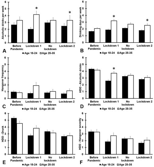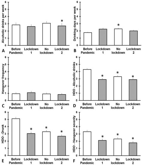 Alcohol consumption and hangovers during the 2019 coronavirus disease (COVID-19) pandemic. Means and standard errors are shown for: (1) the period before the COVID-19 pandemic, (2) the first lockdown period (March–December 2020), (3) summer 2021 (January–March 2021, no lockdown), and (4) the second lockdown (April–July 2021). Data are shown for: (A) number of alcoholic drinks consumed per week, (B) drinking days per week, (C) hangover frequency per month, (D) number of alcoholic drinks consumed on the heaviest drinking occasions, (E) drunkenness (subjective intoxication) on the heaviest drinking occasions, and (F) hangover severity the day after the heaviest drinking occasion. Differences from ‘before the COVID-19 pandemic” are considered significant, after Bonferroni’s correction, if p < 0.017, and are indicated by *. Abbreviation: HDO = heaviest drinking occasion.