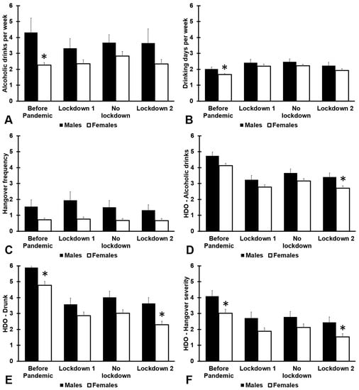 Sex differences in alcohol consumption and hangovers during the COVID-19 pandemic. Means and standard errors are shown for: (1) the period before the COVID-19 pandemic, (2) the first lockdown period (March–December 2020), (3) summer 2021 (January-March 2021, no lockdown), and (4) the second lockdown (April–July 2021). Data are shown for: (A) number of alcoholic drinks consumed per week, (B) drinking days per week, (C) hangover frequency per month, (D) number of alcoholic drinks consumed on the heaviest drinking occasions, (E) drunkenness (subjective intoxication) on the heaviest drinking occasions, and (F) hangover severity the day after the heaviest drinking occasion. Differences between males and females are considered significant, after Bonferroni’s correction, if p < 0.0125, and are indicated by *. Abbreviation: HDO = heaviest drinking occasion.