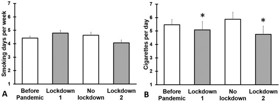 Smoking during the COVID-19 pandemic. Means and standard errors are shown for: (1) the period before the COVID-19 pandemic, (2) the first lockdown period (March–December 2020), (3) summer 2021 (January–March 2021, no lockdown), and (4) the second lockdown (April–July 2021). Data are shown for: (A) number of smoking days per week, and (B) number of cigarettes smoked per day. Differences from ‘before the COVID-19 pandemic’ are considered significant, after Bonferroni’s correction, if p < 0.017, and are indicated by *.