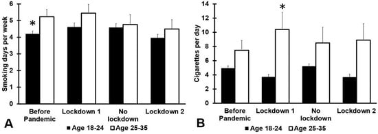 Smoking during the COVID-19 pandemic, according to age group. Means and standard errors are shown for: (1) the period before the COVID-19 pandemic, (2) the first lockdown period (March–December 2020), (3) summer 2021 (January–March 2021, no lockdown), and (4) the second lockdown (April–July 2021). Data are shown for: (A) number of smoking days per week, and (B) number of cigarettes smoked per day. Differences between 18–24 year old and 25–35 year old participants are considered significant, after Bonferroni’s correction, if p < 0.0125, and are indicated by *.