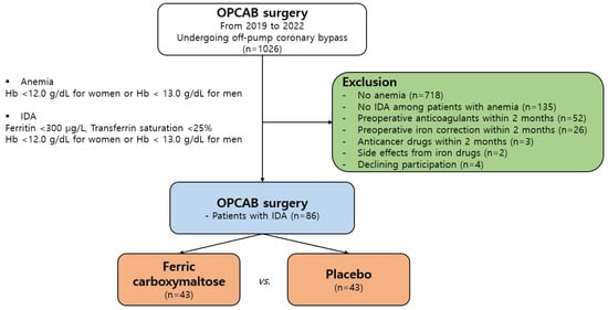 A total of 1026 consecutive patients who underwent OPCAB or minimally invasive direct coronary artery bypass (MIDCAB) between February 2019 and March 2022 were screened in this single-center, prospective, open-label, randomized controlled study. Patients aged ≥19 years with iron deficiency anemia (IDA) who underwent elective OPCAB or MIDCAB surgery, performed by one surgeon (Y. N. Y) who had carried out more than 1000 OPCAB surgeries, were included in this study. Patients without anemia (n = 718) and those without IDA (n = 135) were excluded from this study. Patients on preoperative anticoagulants (n = 52), iron correction treatment (oral or intravenous, n = 56), or drugs that could cause bone marrow suppression, such as anticancer drugs (n = 3), in the two months prior to surgery were excluded from the study. Patients with a history of hypersensitivity reactions, those who experienced side effects from iron drugs (n = 2), and those who declined participation (n = 4) were also excluded. Finally, we enrolled patients with IDA (ferritin < 300 μg/L, transferrin saturation < 25%, hemoglobin (Hb): <12.0 g/dL for women and <13.0 g/dL for men), which was determined preoperatively. The patients were randomly assigned to the IVFC group (intravenous (IV) Ferinject, n = 43) or the placebo group (IV normal saline, n = 43) (Figure 1).