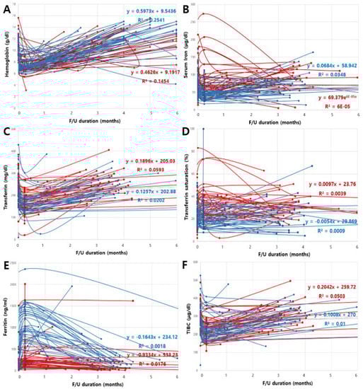 Individual trees of the distinct hematologic parameters were measured in order to evaluate the early changes after surgery (Figure 2). The LMM also indicated that the parameters changed over time. In the IVFC group, the transferrin concentration exhibited the steepest increase (0.1257/month; p = 0.020), followed by the TIBC (0.1008/month; p = 0.010) and serum iron concentration (0.0684/month; p = 0.0348). The LMM revealed statistically significant between-group differences in changes in the serum iron concentration, TIBC, transferrin saturation, transferrin concentration, and ferritin concentration during the follow-up period.